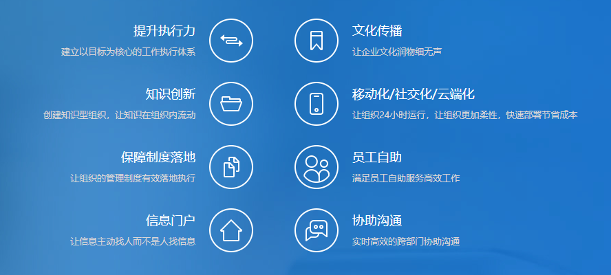 - 執行力提升、知識創新、信息整合、員工自助高效辦公、費用管控、移動辦公、安全便捷