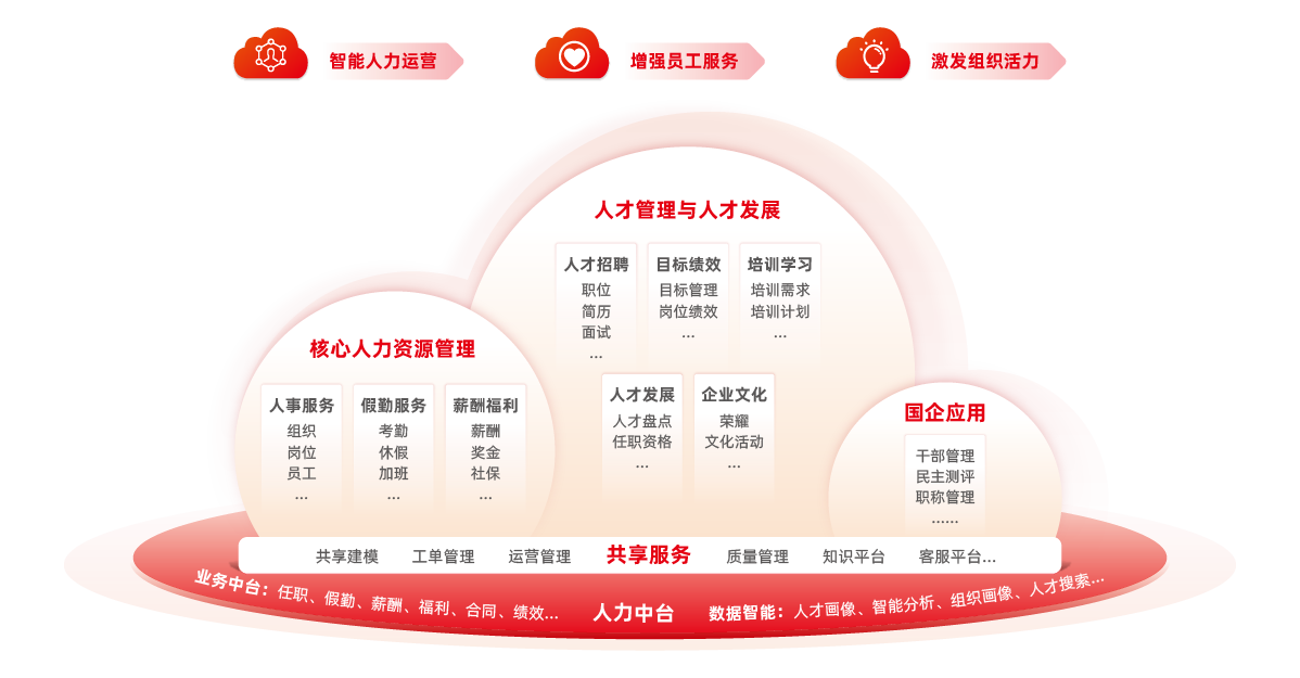 人力云以"賦能員工、激活組織"為宗旨,圍繞"卓越員工服務、智能人力運營、敏捷組織決策"核心價值,通過組織發(fā)展、員工體驗、人力共享、智能招聘、 干部管理、目標績效管理、人才發(fā)展、企業(yè)文化、數(shù)據(jù)智能等,涵蓋社會化用工服務、數(shù)智化人才培養(yǎng)服務等業(yè)務服務,以及人力資源管理數(shù)智化轉(zhuǎn)型咨詢與規(guī)劃服務,構建完整的、一體化數(shù)智人力資源解決方案。