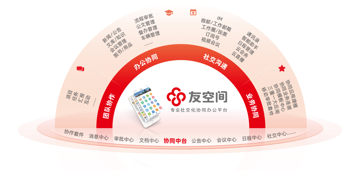 友空間為企業提供開放靈活的自定義協同應用建模與業務擴展,支持企業 0 代碼搭建個性化業務應用;同時,提供IM溝通、附件、評論、任務、協作流程、分享、自定義消息模板7大協作套件,可被企業其他業務應用靈活接入,實現業務與協同真正無縫融合,讓企業多業務協作無界限!