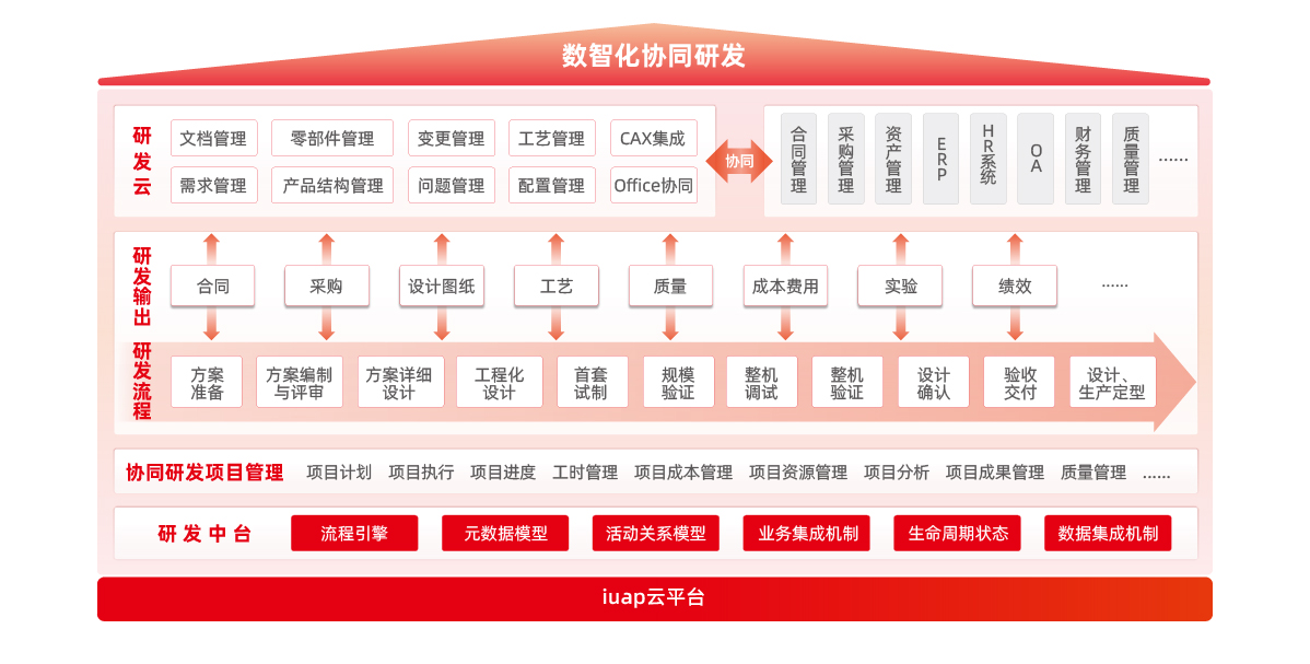 研發云旨在幫助研發創新性高端制造企業打造研發創新管理平臺。研發云以研發項目管理為業務主線,實現高效高質量的產品研發全生命周期的全過程管控;以元數據模型構建的BOM為核心,實現精準的產品數據全生命周期管理,有效的縮短產品開發周期、降低產品開發成本,保障產品快速上市獲得高額利潤,助力工業企業數智化研發轉型,全面提升企業的研發創新能力。